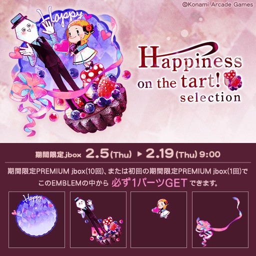 【しあわせをたっぷりのせて!】 本日より期間限定jbox「Happiness on the tart!・セレクション」が登場! 初回のみ「期間限定 PREMIUM jbox(1回)」でSPエンブレムのパーツから1つ確定で出現しますよ! http://eagate.573.jp/game/jubeat/beyond/jbox/
