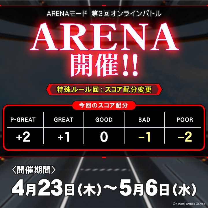 【イベントのお知らせ】 『ARENAモード』の第3回オンラインバトルが開催決定! 今回は新特殊ルール「スコア配分変更」での開催!ミスでスコアが減少する厳しいルールに挑戦しよう! 開催期間は4/23(木)~5/6(水)まで! 開始までにもらえる「ストックアリーナキューブ」も積極的に活用しよう! #IIDX